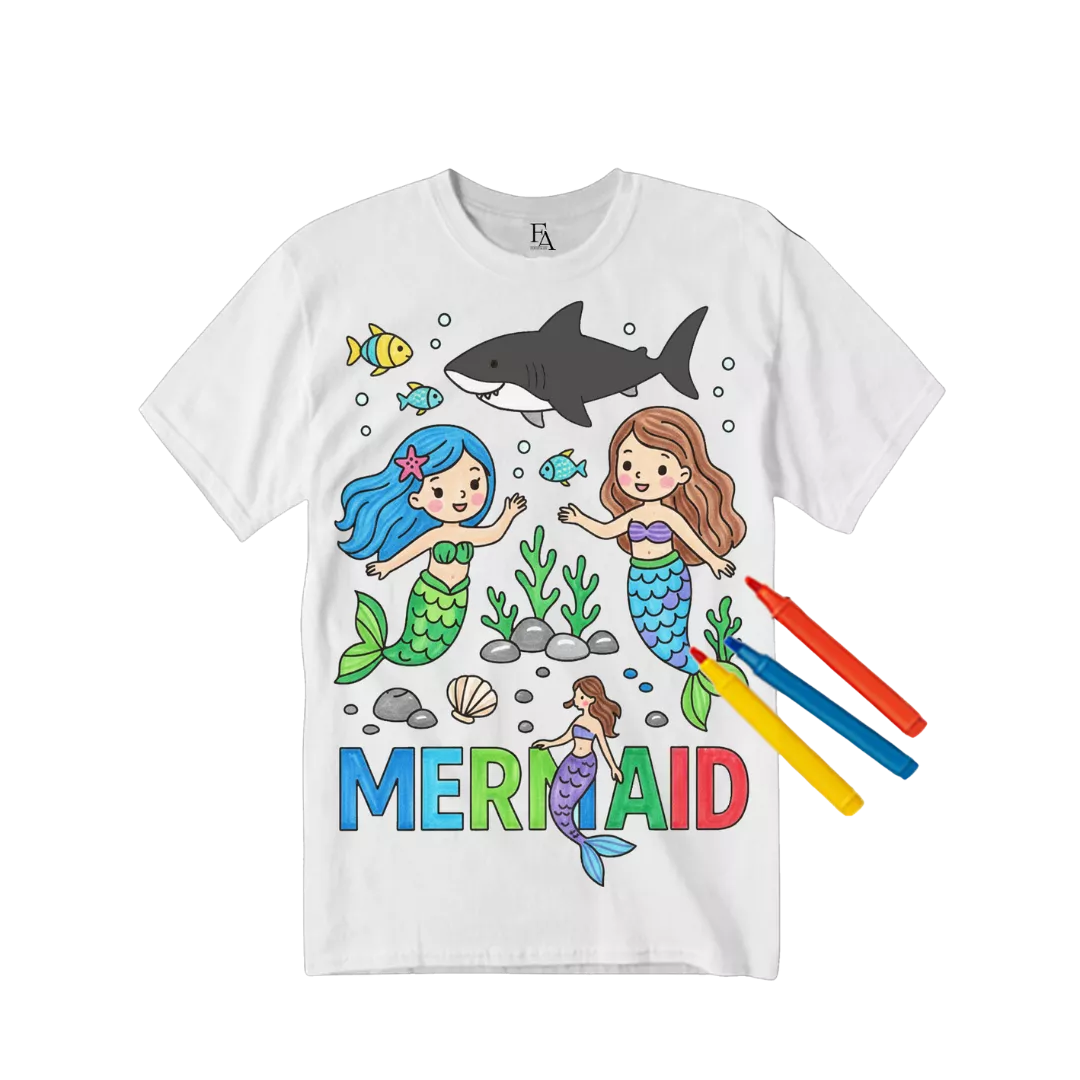Love mermaids and the ocean? Color your own underwater world with this magical T-shirt. Use the washable markers to bring mermaids, fish, and corals to life. Wash and recolor anytime. Perfect for kids who dream of the sea and love ocean adventures.