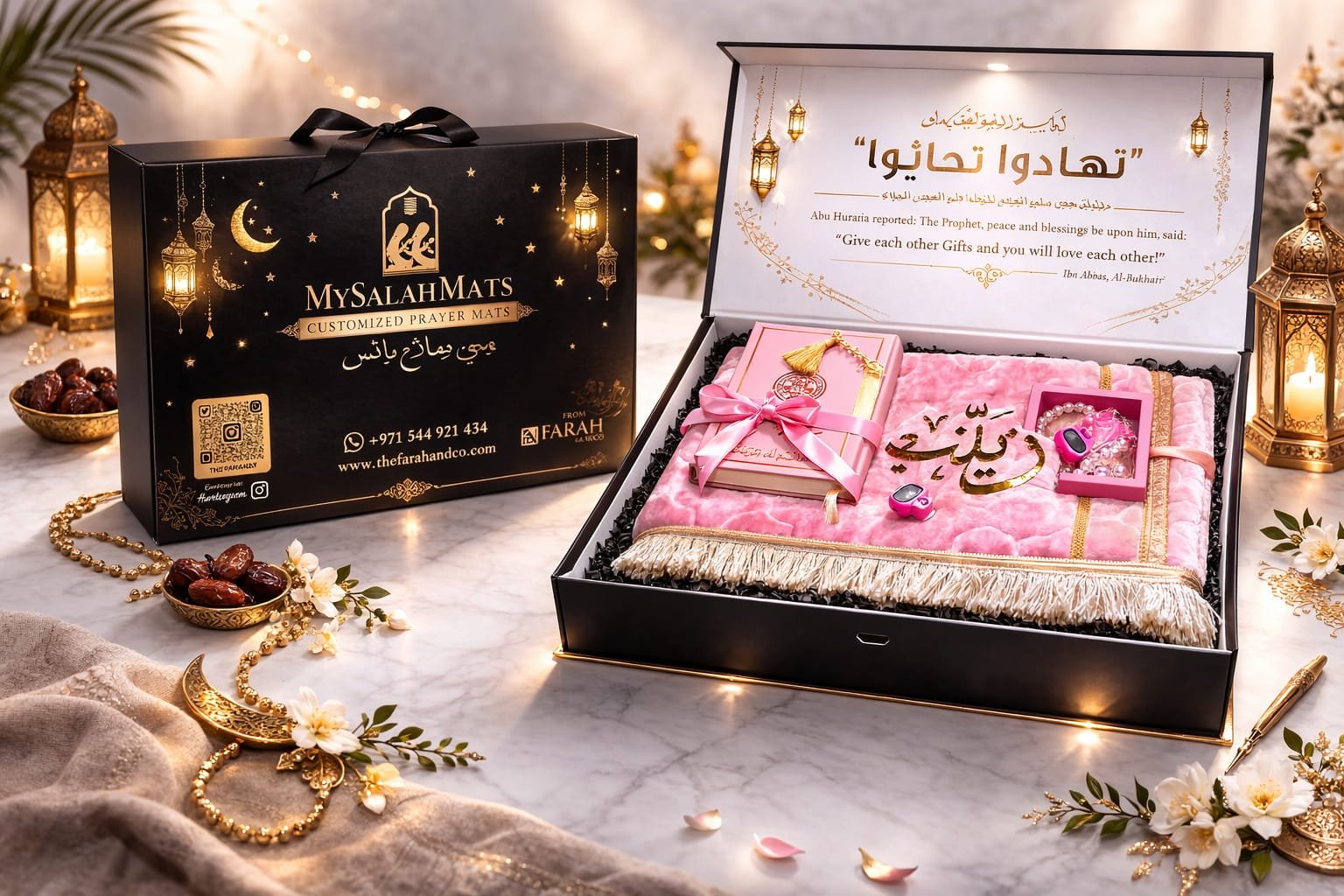 This gift pack brings together comfort, devotion, and personal meaning. It includes a premium MySalahMat prayer mat and a black Holy Quran 14x 20cm , both designed for daily use and special gifting. The prayer mat offers a soft surface and supportive padding to keep you comfortable during prayer. The design helps you stay focused and steady. The Holy Quran comes in an elegant black cover and is printed with a personalized name. This detail makes the gift meaningful and memorable. The Quran features clear text that supports easy reading and regular recitation. This gift pack suits Ramadan, Eid, weddings, birthdays, and other special occasions. It is ideal for personal use or as a thoughtful gift for family and friends. Bullet Points • Complete gift set with prayer mat and Holy Quran • Personalized name printed on the black Quran 14 x 20 cm • Premium quality prayer mat for daily comfort • Soft surface suitable for knees and hands • Elegant black theme for a refined look • Suitable for men and women • Ideal for Ramadan, Eid, and special gifting • Meaningful and practical Islamic gift setAdditional information