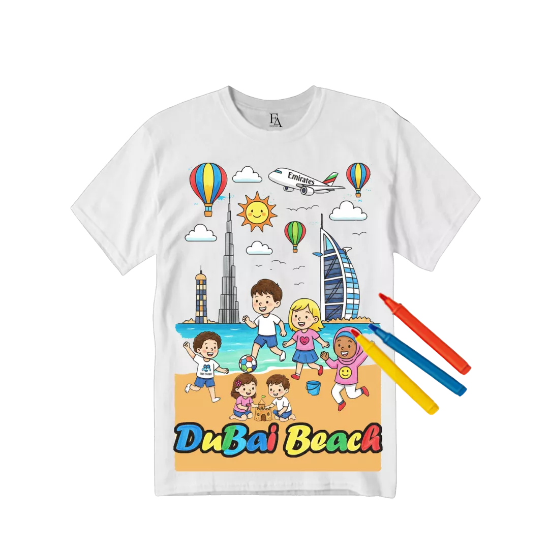 Love Dubai and the beach? Color your own Dubai Beach Vibes T-shirt and capture the city’s sunny spirit. Use the washable markers to fill in palm trees, waves, and Dubai icons. Wash, dry, and recolor anytime. Perfect for beach lovers and little Dubai fans who enjoy creative fun.