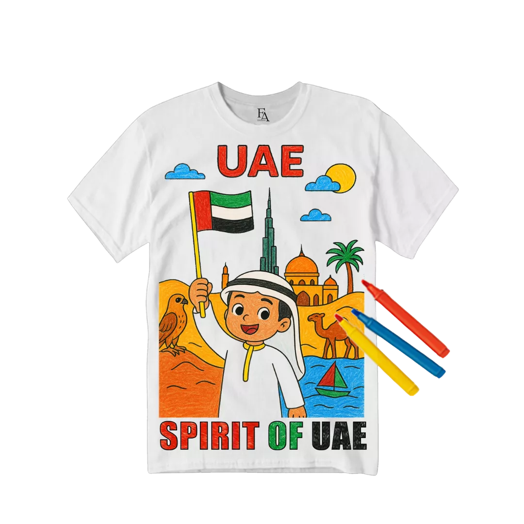 Let your child color their own T-shirt featuring UAE flags, falcons, and landmarks.